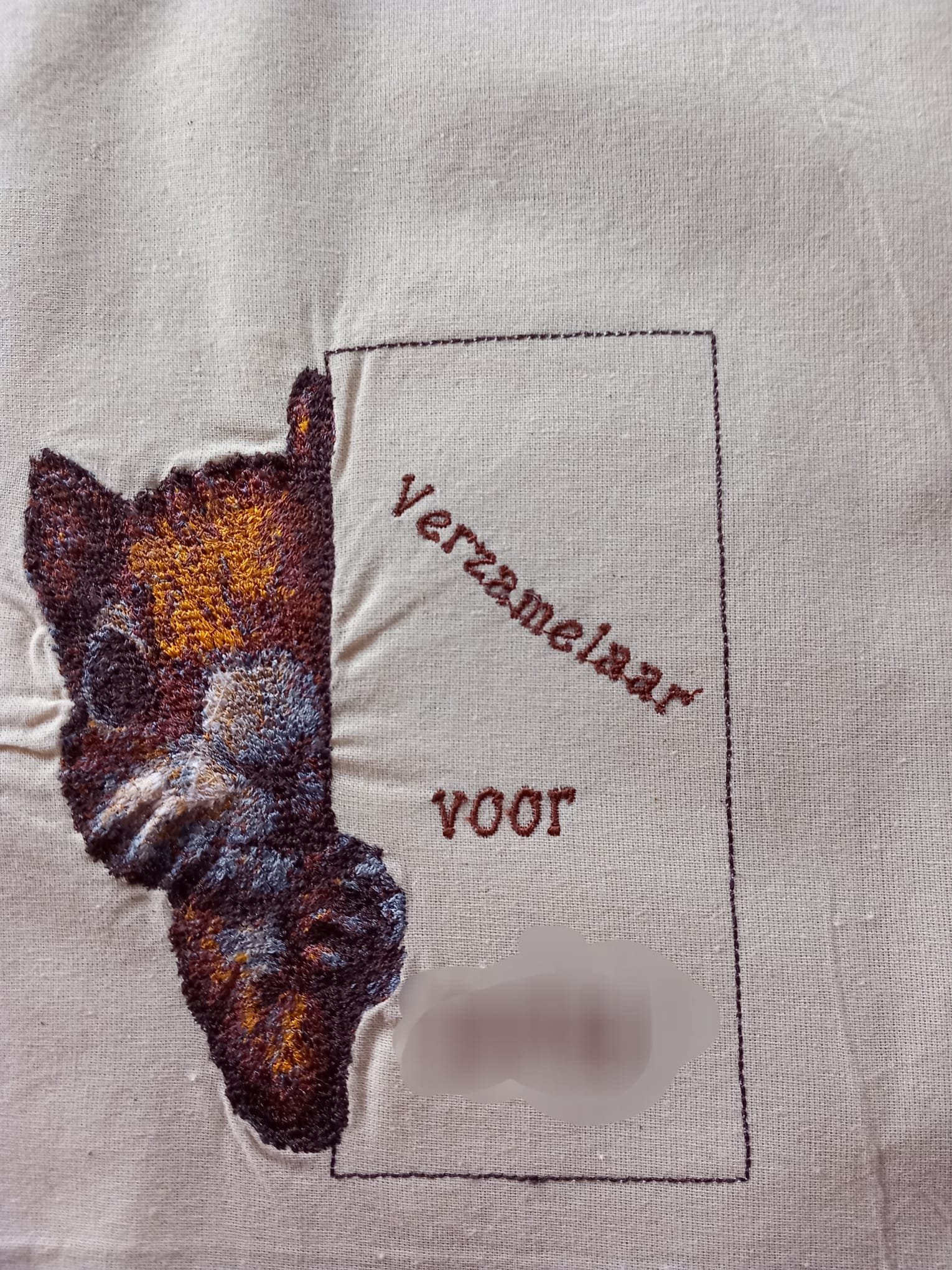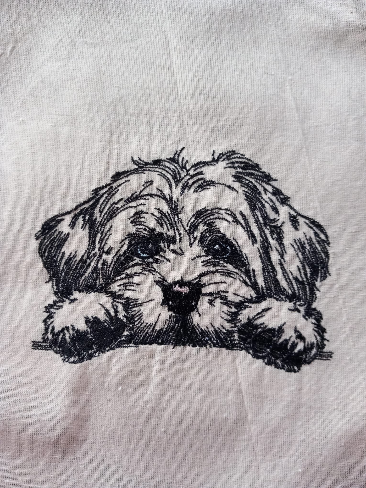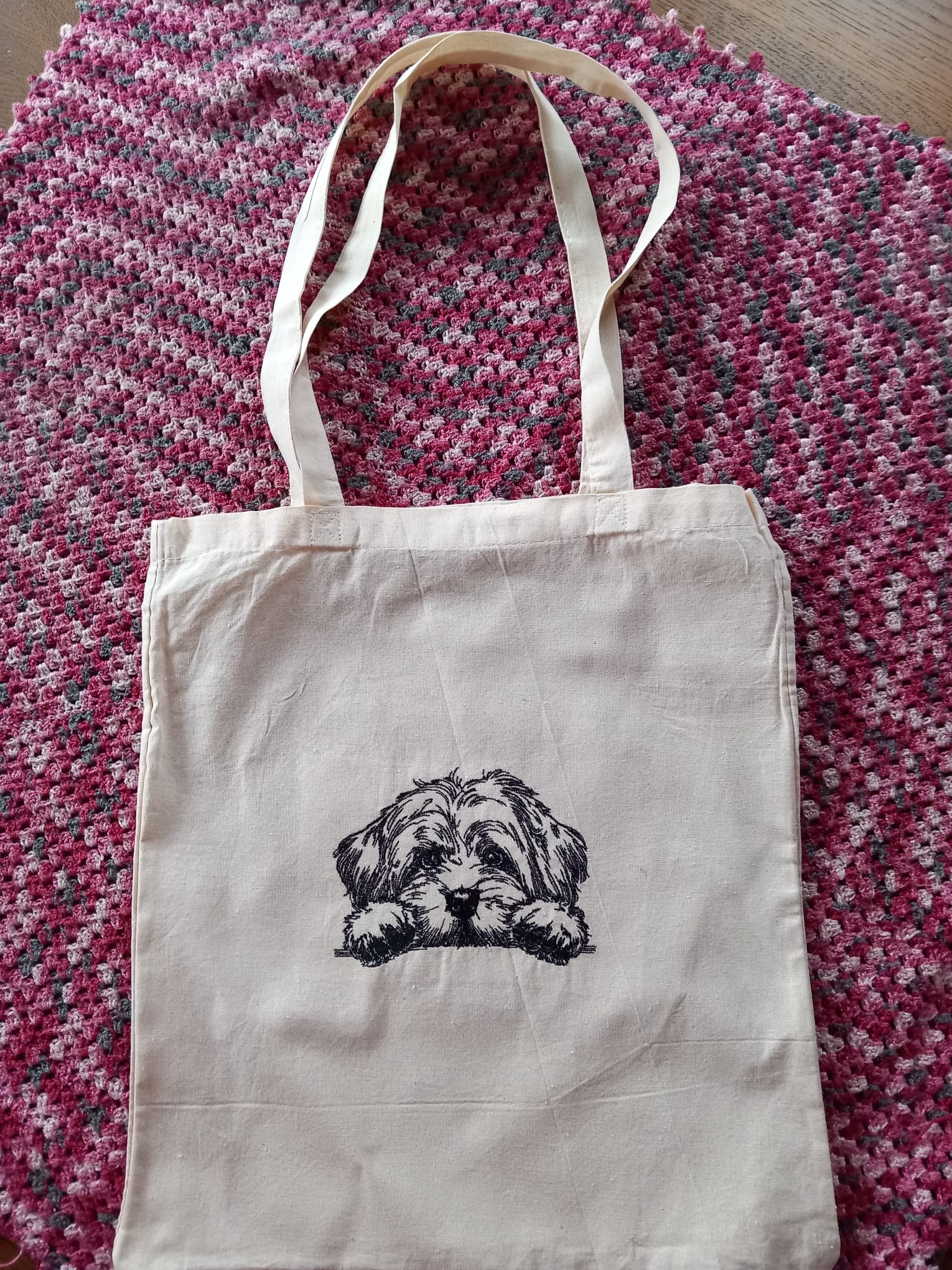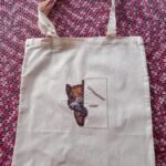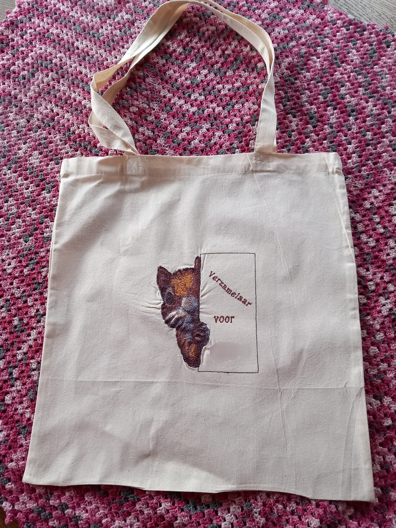 Katoenen tas met uw unieke geborduurde afbeelding. Bijvoorbeeld een foto van uw huisdier of kind.